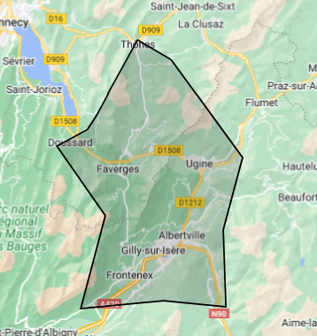 J'interviens, dans vos locaux, entre la Savoie et la Haute-Savoie selon la carte suivante (ou approximativement).